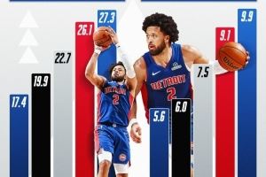 体育资讯11月21日讯 NBA官方晒出了康宁汉姆五个赛季以来的得分、助攻数据的提升表现。