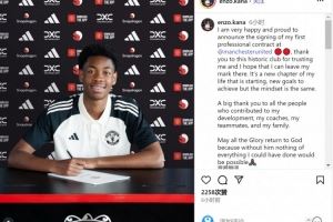 比伊克社媒晒出签约照片,配文:“我非常高兴和自豪地宣布,我与曼联签订了我的第一份职业合同,感谢这家历史悠久的俱乐部对我的信任,我希望我能在这里留下自己的印记。这是我人生新篇章的开始,有新的目标要实现,但我的心态依然如故。”