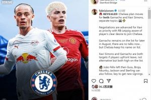 罗马诺在社交媒体上表示,加纳乔和哈维-西蒙斯都在切尔西的引援名单之中,加纳乔为他的这条动态点赞。