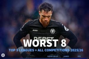 体育资讯11月21日讯 五大联赛即将重燃战火,《转会市场》统计了本赛季至今五大联赛球队的各项赛事场均拿分最少情况,英超的狼队以场均0.57分垫底。